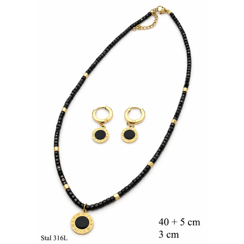 Elegancki i nowoczesny komplet biżuterii, który łączy minimalizm z wyrazistym stylem. W skład zestawu wchodzi naszyjnik z czarnych koralików oraz dopasowane kolczyki koła z zawieszką, tworząc spójną i stylową całość.