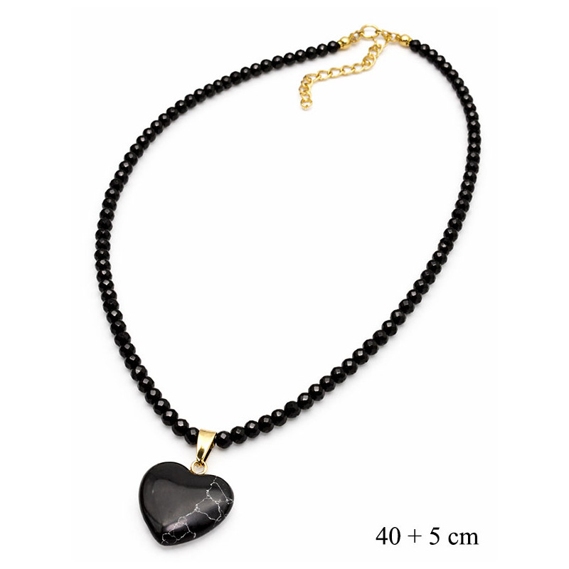 Elegancki i ponadczasowy naszyjnik wykonany z drobnych, fasetowanych czarnych koralików, które subtelnie odbijają światło. Centralnym elementem jest zawieszka w kształcie serca z charakterystycznym, marmurkowym użyleniem, nadającym całości wyjątkowego stylu.