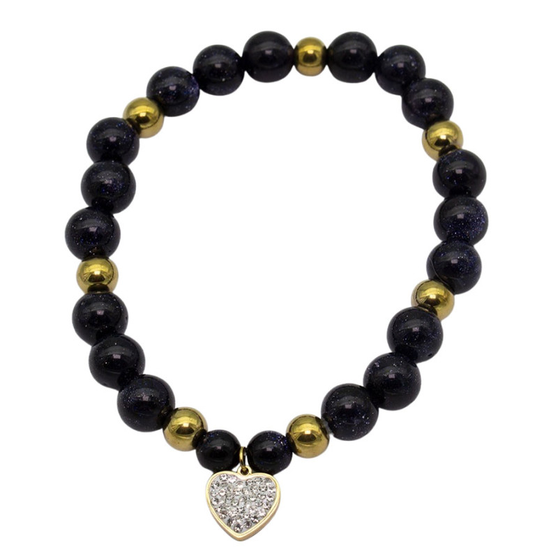 Bransoletka wyróżnia się głęboką, niemal nocną kolorystyką koralików o subtelnym, drobno iskrzącym wykończeniu. Kuliste elementy w odcieniu granatu lub czerni tworzą spójną, elegancką bazę, którą przełamują złote akcenty rozmieszczone rytmicznie na całym obwodzie. Centralnym punktem jest niewielka zawieszka w kształcie serca, wypełniona błyszczącymi drobinkami, które efektownie odbijają światło. Całość prezentuje się harmonijnie i przyciąga uwagę kontrastem barw.