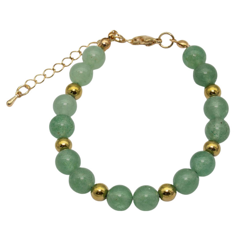 Bransoletka wyróżnia się subtelną kolorystyką w odcieniach jasnej, lekko przygaszonej zieleni. Kuliste koraliki mają gładką powierzchnię z delikatnymi, naturalnie wyglądającymi przejściami tonalnymi, co nadaje całości spokojny i harmonijny charakter. Złote przekładki rozmieszczone między elementami wprowadzają elegancki kontrast i podkreślają rytm kompozycji. Całość uzupełnia klasyczne zapięcie z łańcuszkiem przedłużającym, który pozwala na dopasowanie długości do nadgarstka.