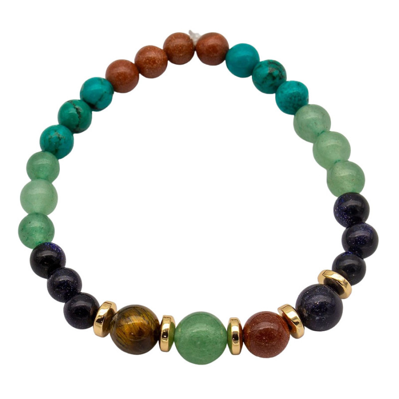 Bransoletka przyciąga uwagę różnorodnością kolorów i faktur, które tworzą dynamiczną, ale spójną całość. Okrągłe koraliki w odcieniach zieleni, turkusu, głębokiego granatu oraz ciepłego brązu układają się w nieregularny, ciekawy rytm. Powierzchnia elementów jest gładka, miejscami z delikatnym połyskiem lub subtelnym efektem drobinek. Centralną część podkreślają złote przekładki oraz większe koraliki o bardziej wyrazistym charakterze, które przyciągają wzrok i nadają kompozycji punkt skupienia.