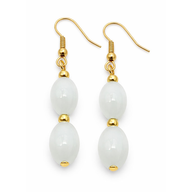 Kolczyki wyróżniają się jasną, stonowaną kolorystyką, która nadaje im delikatny i uporządkowany charakter. Dwa owalne koraliki w mlecznobiałym odcieniu tworzą wydłużoną, harmonijną formę. Ich gładka, lekko połyskująca powierzchnia odbija światło w subtelny sposób, podkreślając spokojny wygląd całości. Złote elementy umieszczone pomiędzy koralikami oraz przy zapięciu wprowadzają elegancki kontrast i nadają całości wyraźniejszego akcentu wizualnego. Klasyczne bigle zapewniają swobodę ruchu i lekkie układanie się kolczyków.
