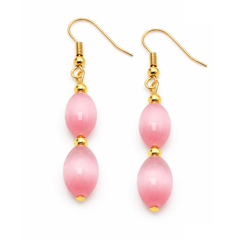 Kolczyki przyciągają uwagę subtelnym, pudrowym odcieniem różu, który nadaje im lekkiego i harmonijnego charakteru. Dwa owalne koraliki ułożone pionowo tworzą smukłą, wydłużoną formę, która delikatnie porusza się przy każdym ruchu. Ich powierzchnia jest gładka, z miękkim przejściem tonalnym, co wzmacnia efekt delikatności. Złote elementy umieszczone pomiędzy koralikami oraz przy zapięciu wprowadzają wyraźny, ale nienachalny kontrast i podkreślają całość kompozycji.