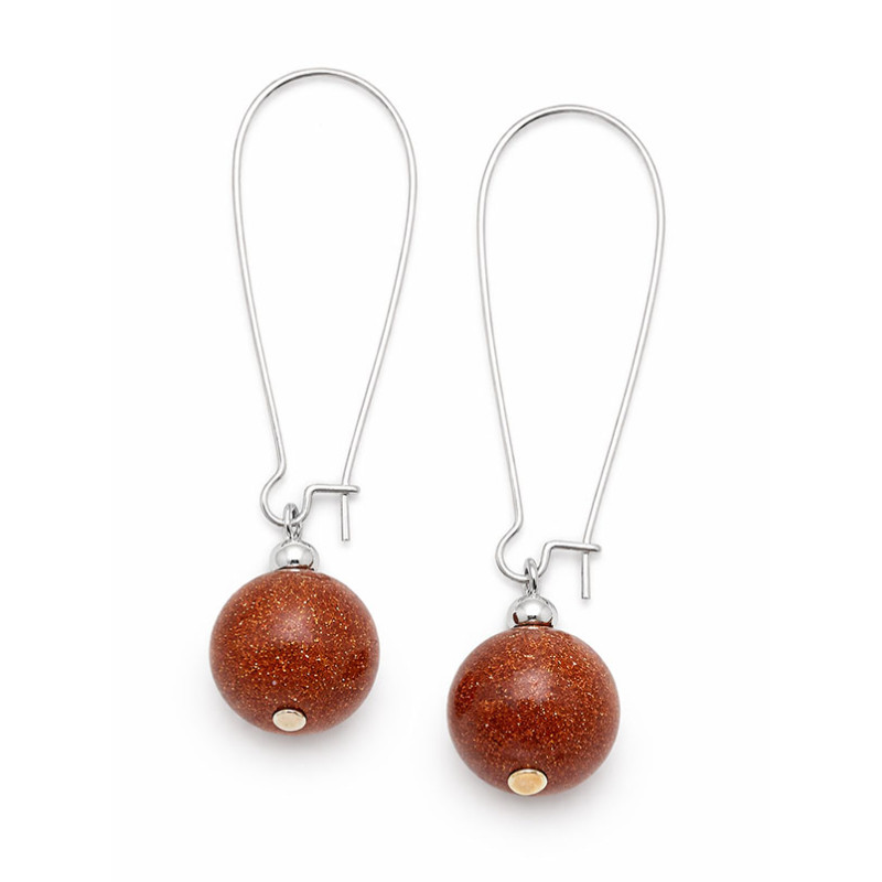 Kolczyki wyróżniają się kulistymi koralikami w ciepłym, rdzawo-brązowym odcieniu, wzbogaconym subtelnym efektem drobnych, połyskujących refleksów. Gładka powierzchnia podkreśla głębię koloru i nadaje całości dekoracyjnego charakteru. Elementy zawieszone są na wydłużonych, smukłych biglach w srebrnym kolorze, które tworzą lekką, nowoczesną formę i ciekawy kontrast dla ciepłej barwy koralików. Prosta konstrukcja sprawia, że kolczyki prezentują się estetycznie i nie przytłaczają stylizacji.