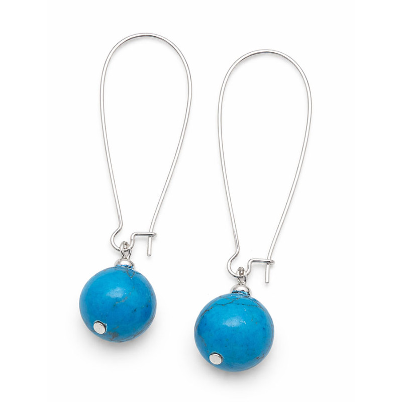 Kolczyki przyciągają uwagę wyrazistym, turkusowym kolorem koralików, który został urozmaicony delikatnymi, naturalnie wyglądającymi żyłkami. Kulista forma nadaje całości prosty, uporządkowany charakter, a gładka powierzchnia subtelnie odbija światło. Elementy zawieszone są na wydłużonych, srebrnych biglach, które tworzą lekką i nowoczesną linię, jednocześnie podkreślając intensywność barwy. Kontrast między chłodnym odcieniem metalu a nasyconym kolorem koralików nadaje kompozycji wyrazistości.