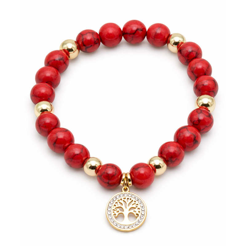 Bransoletka wyróżnia się nasyconą, głęboką czerwienią koralików, które zdobią delikatne, nieregularne żyłkowania nadające całości naturalny charakter. Kuliste elementy tworzą spójną, rytmiczną formę, a ich gładka powierzchnia subtelnie odbija światło. Złote przekładki rozmieszczone pomiędzy koralikami przełamują intensywność koloru i wprowadzają elegancki kontrast. Centralnym punktem jest okrągła zawieszka z motywem drzewa życia, otoczona drobnymi, błyszczącymi detalami, które dodają całości dekoracyjnego wyrazu.