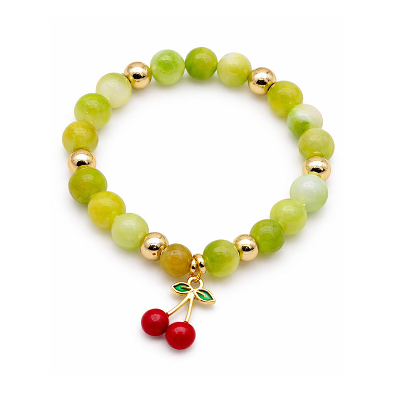 Bransoletka przyciąga uwagę jasną, energetyczną kolorystyką utrzymaną w odcieniach limonkowej i soczystej zieleni. Kuliste koraliki mają gładką, lekko połyskującą powierzchnię oraz subtelne przejścia tonalne, które nadają całości naturalny i lekki charakter. Złote przekładki rozmieszczone między elementami wprowadzają elegancki kontrast i porządkują kompozycję. Centralnym punktem jest zawieszka w formie wisienek – czerwone kuleczki z zielonymi listkami dodają całości świeżości i dekoracyjnego, zabawnego akcentu.