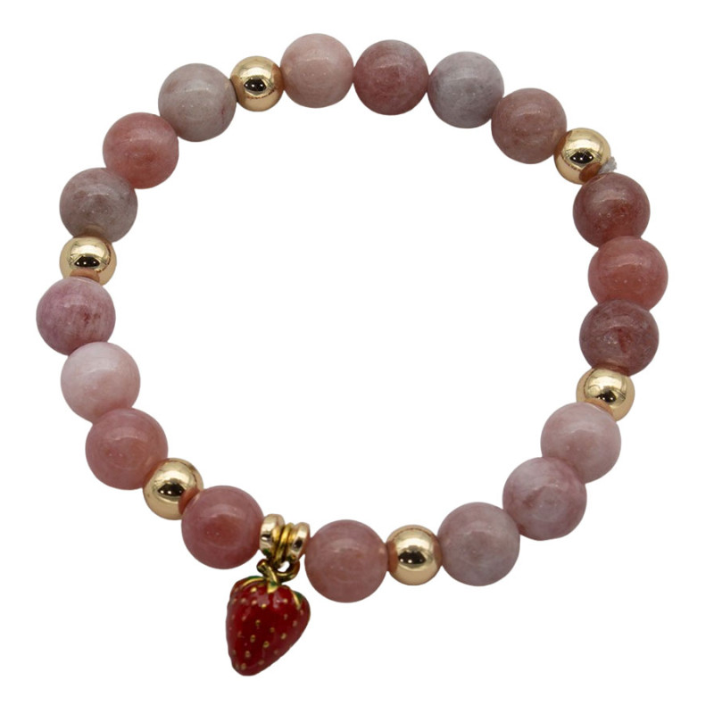 Bransoletka zachwyca delikatną, stonowaną kolorystyką w odcieniach pudrowego różu i jasnego beżu. Kuliste koraliki mają gładką powierzchnię oraz subtelne, naturalnie wyglądające przejścia tonalne, które nadają całości spokojny i harmonijny charakter. Złote przekładki rozmieszczone między elementami wprowadzają elegancki kontrast i podkreślają rytm kompozycji. Centralnym detalem jest zawieszka w kształcie truskawki, która dodaje całości lekkości i przyciąga uwagę niewielkim, dekoracyjnym akcentem.