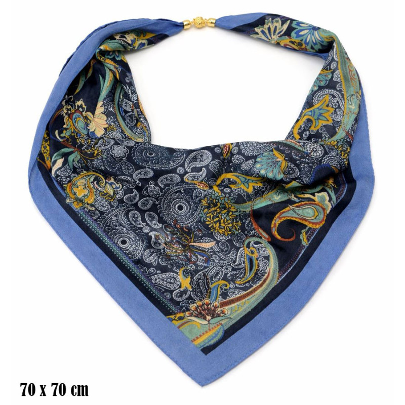 Apaszka o wymiarach 70 x 70 cm przyciąga uwagę bogatym, dekoracyjnym wzorem inspirowanym motywem paisley. Na ciemnym tle widoczne są misternie rozmieszczone ornamenty w odcieniach błękitu, zieleni, żółci i beżu, które tworzą wielowarstwową kompozycję. Całość uzupełnia jednolita, niebieska ramka, nadająca formie wyraźne wykończenie. Materiał układa się miękko i plastycznie, dzięki czemu apaszka dobrze prezentuje się w klasycznym, trójkątnym ułożeniu.
