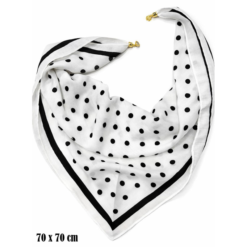 Apaszka o wymiarach 70 x 70 cm prezentuje ponadczasowy wzór czarnych kropek na jasnym tle. Regularnie rozmieszczone grochy tworzą lekki, rytmiczny efekt, który przyciąga wzrok i nadaje całości swobodnego charakteru. Kompozycję zamyka cienka, kontrastowa ramka w czarnym kolorze, podkreślająca kształt i wykończenie apaszki. Materiał układa się miękko i naturalnie, dzięki czemu model dobrze prezentuje się zarówno luźno, jak i bardziej dopasowany przy szyi.