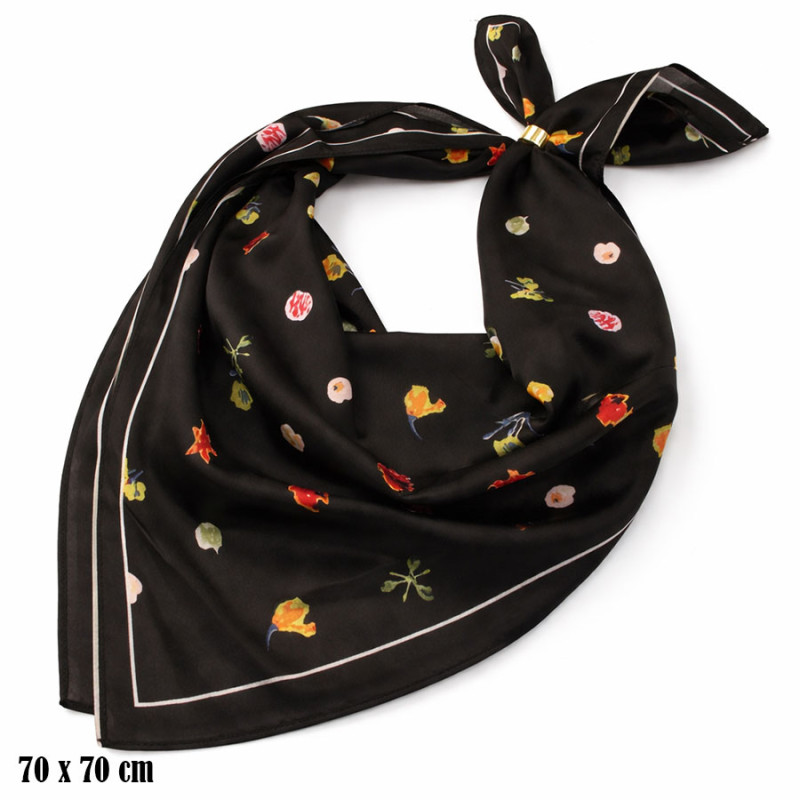 Apaszka o wymiarach 70 x 70 cm przyciąga uwagę kontrastowym zestawieniem czerni i subtelnych, kolorowych detali. Na głębokim, ciemnym tle rozmieszczone są drobne motywy kwiatowe w odcieniach czerwieni, żółci, zieleni i beżu, które tworzą lekką, nieregularną kompozycję. Całość została wykończona cienką, jasną ramką, podkreślającą kształt i nadającą apaszce uporządkowany wygląd. Materiał układa się miękko i naturalnie, tworząc eleganckie fałdy.