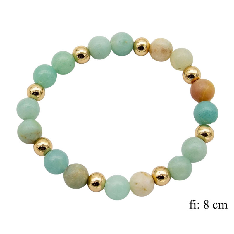 Stylowa bransoletka wykonana z kamieni w odcieniach zieleni to modny i uniwersalny dodatek, który doskonale wpisuje się w aktualne trendy biżuteryjne. Koraliki o matowym wykończeniu zestawione zostały ze złotymi kulkami, które nadają całości eleganckiego i nowoczesnego charakteru.