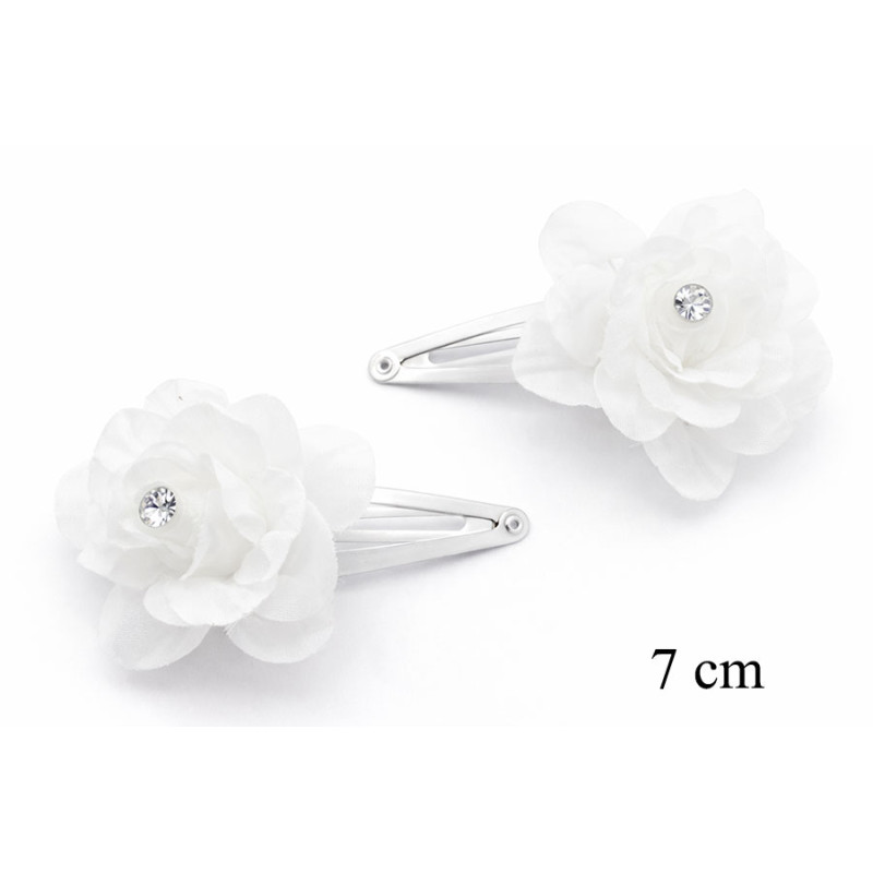 Eleganckie spinki do włosów ozdobione delikatnymi białymi kwiatami to wyjątkowy dodatek, który podkreśli każdą stylizację. Subtelne płatki wykonane z lekkiego materiału tworzą efekt naturalnego, pełnego kwiatu, a umieszczony w centrum błyszczący kryształek dodaje całości elegancji i blasku.