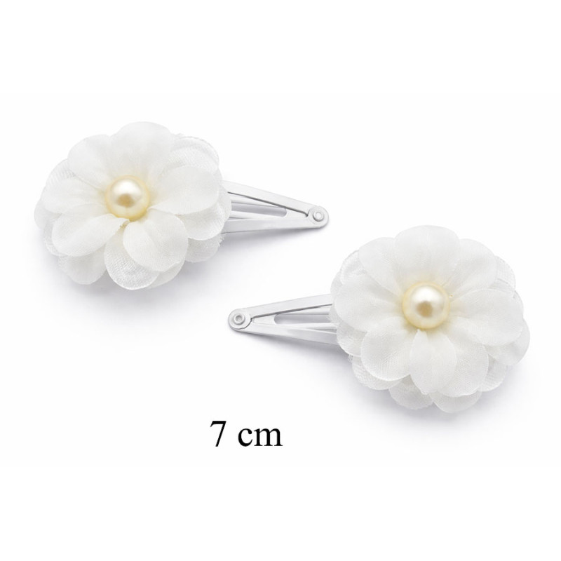 Eleganckie spinki do włosów ozdobione subtelnymi białymi kwiatami z perełką to stylowy dodatek idealny na wyjątkowe okazje. Delikatne, wielowarstwowe płatki tworzą efekt pełnego kwiatu, a centralnie umieszczona perełka nadaje całości klasycznego i ponadczasowego charakteru.