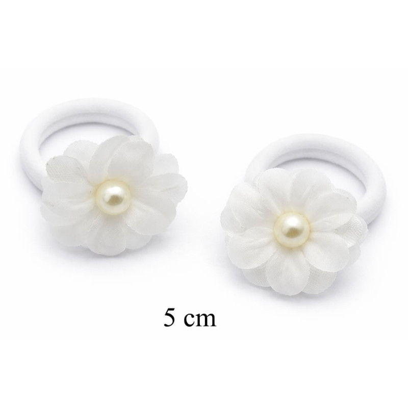 Urocze gumki do włosów ozdobione delikatnymi białymi kwiatami z perełką to elegancki dodatek, który doskonale uzupełni każdą stylizację. Lekkie, materiałowe płatki tworzą efekt subtelnego kwiatu, a centralnie umieszczona perełka nadaje całości klasycznego i ponadczasowego wyglądu.