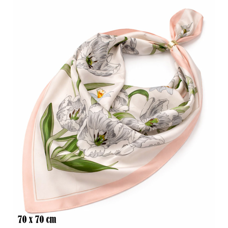 Apaszka o wymiarach 70 x 70 cm wyróżnia się wyrazistym, a jednocześnie lekkim wzorem kwiatowym. Na jasnym tle widoczne są duże, jasne kwiaty z subtelnymi szarymi konturami oraz zielone liście, które nadają całości naturalnego charakteru. Kompozycję dopełnia delikatna, pudrowa ramka, podkreślająca kształt i dodająca całości miękkości. Materiał układa się swobodnie, tworząc naturalne fałdy i elegancki efekt przy każdym ułożeniu.