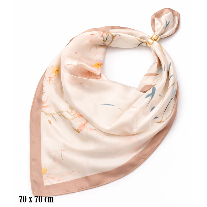 Apaszka o wymiarach 70 x 70 cm utrzymana jest w lekkiej, rozjaśnionej kolorystyce, która nadaje jej spokojnego i eleganckiego charakteru. Na jasnym tle pojawiają się delikatne, nieregularne motywy przypominające malarskie pociągnięcia w odcieniach beżu, brzoskwini i przygaszonego błękitu. Całość uzupełnia miękka, pudrowa ramka, która podkreśla kształt i dodaje kompozycji harmonii. Materiał układa się swobodnie, tworząc naturalne fałdy i lekki efekt wizualny.