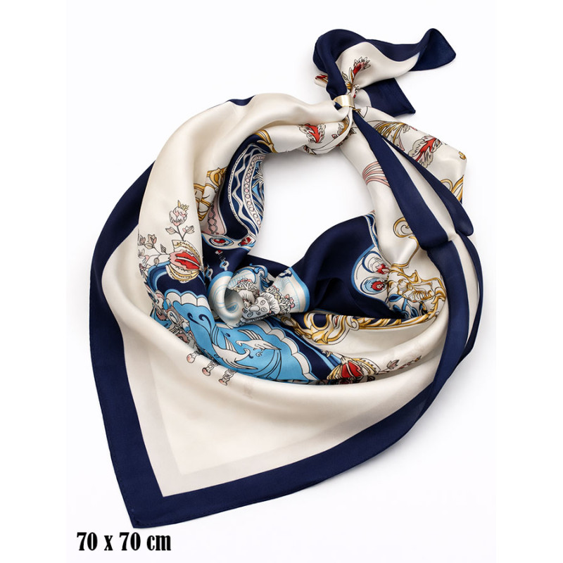 Apaszka o wymiarach 70 x 70 cm wyróżnia się bogatą, dekoracyjną kompozycją inspirowaną ilustracyjnymi motywami. Na jasnym tle widoczne są wielobarwne detale w odcieniach granatu, błękitu, czerwieni i złamanej żółci, które tworzą dynamiczny, przyciągający wzrok wzór. Całość została wykończona szeroką, granatową ramką, podkreślającą kształt i nadającą kompozycji wyraźne wykończenie. Materiał układa się miękko, tworząc naturalne fałdy i elegancki efekt przy każdym ułożeniu.
