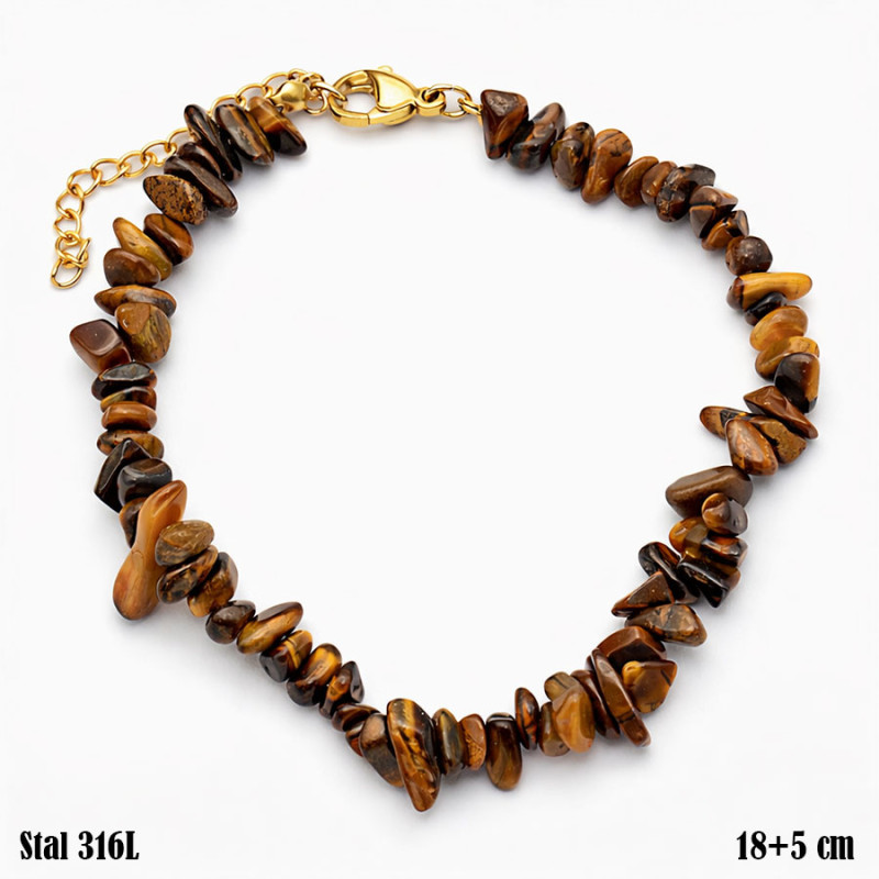 Bransoletka przyciąga uwagę mieszanką nieregularnych kamieni w odcieniach brązu, złota i głębokiej czerni. Każdy element ma inną formę i fakturę, co nadaje całości swobodny, organiczny charakter. Kamienie tworzą gęstą kompozycję, która miękko układa się na nadgarstku. Zapięcie oraz elementy wykończenia mają złoty kolor i kontrastują z naturalną strukturą kamieni. Długość bransoletki wynosi 18+5 cm, co pozwala na dopasowanie do różnych rozmiarów nadgarstka.