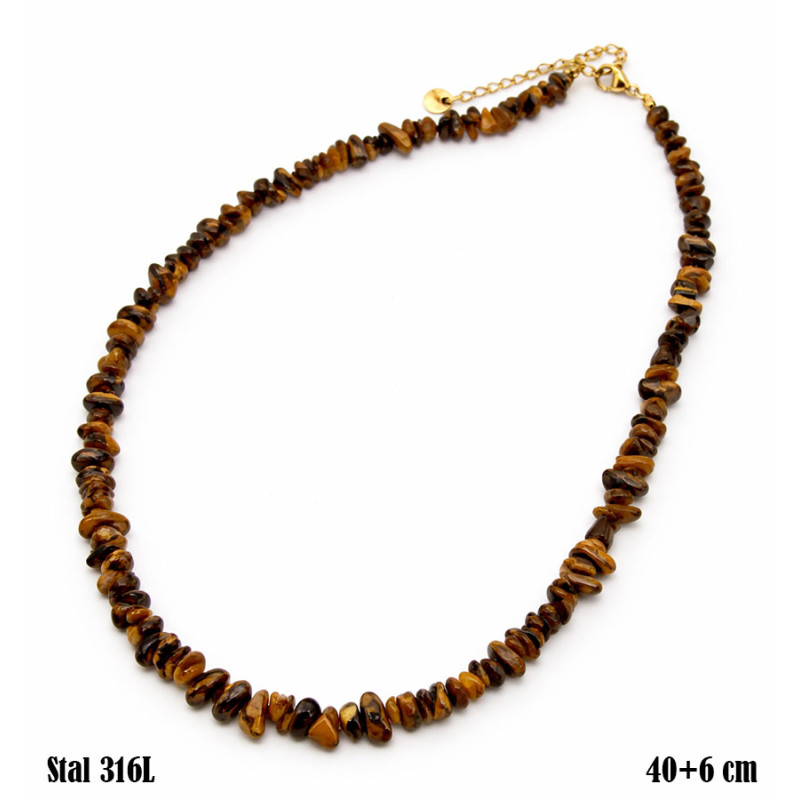 Naszyjnik wyróżnia się nieregularną formą drobnych kamieni w odcieniach miodowego brązu, karmelu oraz ciemnej czerni. Każdy element ma inną wielkość i kształt, dzięki czemu całość tworzy swobodną, lekko surową kompozycję. Kamienie układają się w delikatny łuk wokół szyi, tworząc spójną linię o naturalnym charakterze. Całość dopełnia złote zapięcie z łańcuszkiem przedłużającym. Długość naszyjnika wynosi 40+6 cm, co pozwala na dopasowanie do różnych stylizacji.