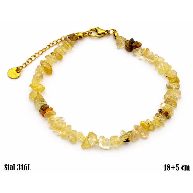 Bransoletka przyciąga wzrok lekką, świetlistą kolorystyką utrzymaną w odcieniach jasnej żółci i złamanej bieli. Nieregularne kamienie tworzą zróżnicowaną strukturę, w której każdy element ma indywidualny kształt i przejrzystość. Całość układa się miękko wokół nadgarstka, tworząc naturalną, swobodną linię. Pojedyncze, ciemniejsze akcenty dodają kontrastu i podkreślają charakter kompozycji. Zapięcie w złotym kolorze harmonijnie współgra z jasnymi tonami kamieni. Długość bransoletki wynosi 18+5 cm, co umożliwia regulację dopasowania.