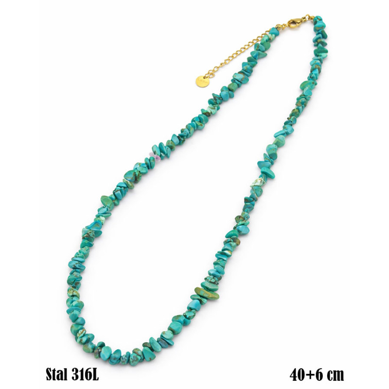 Naszyjnik przyciąga uwagę wyrazistym odcieniem turkusu, przełamanym subtelnymi, nieregularnymi wzorami w tonach beżu i brązu. Kamienie o zróżnicowanych kształtach tworzą lekką, organiczną kompozycję, która układa się swobodnie wokół szyi. Całość prezentuje się naturalnie i dynamicznie, zachowując jednocześnie spójny charakter. Złote zapięcie oraz delikatny łańcuszek regulacyjny stanowią eleganckie wykończenie. Długość naszyjnika wynosi 40+6 cm, co pozwala na dopasowanie do różnych stylizacji i dekoltów.