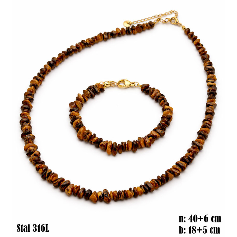 Komplet składający się z naszyjnika i bransoletki tworzy harmonijną całość zbudowaną z nieregularnych kamieni w odcieniach brązu, miodowego złota i głębokiej czerni. Każdy element ma własny kształt i strukturę, co nadaje kompozycji naturalny, swobodny charakter. Kamienie układają się równomiernie, tworząc spójną linię zarówno na szyi, jak i na nadgarstku. Złote zapięcia stanowią estetyczne wykończenie i podkreślają ciepłą kolorystykę zestawu.