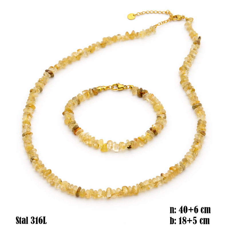 Komplet naszyjnika i bransoletki tworzy spójną całość utrzymaną w jasnych odcieniach żółci, kremu i delikatnego złota. Nieregularne kamienie budują naturalną, swobodną strukturę, w której każdy element ma własny kształt i stopień przejrzystości. Całość prezentuje się lekko i świeżo, subtelnie odbijając światło. Pojedyncze, ciemniejsze akcenty przełamują jasną kompozycję i dodają jej głębi. Złote zapięcia harmonizują z kolorystyką kamieni i podkreślają charakter zestawu.