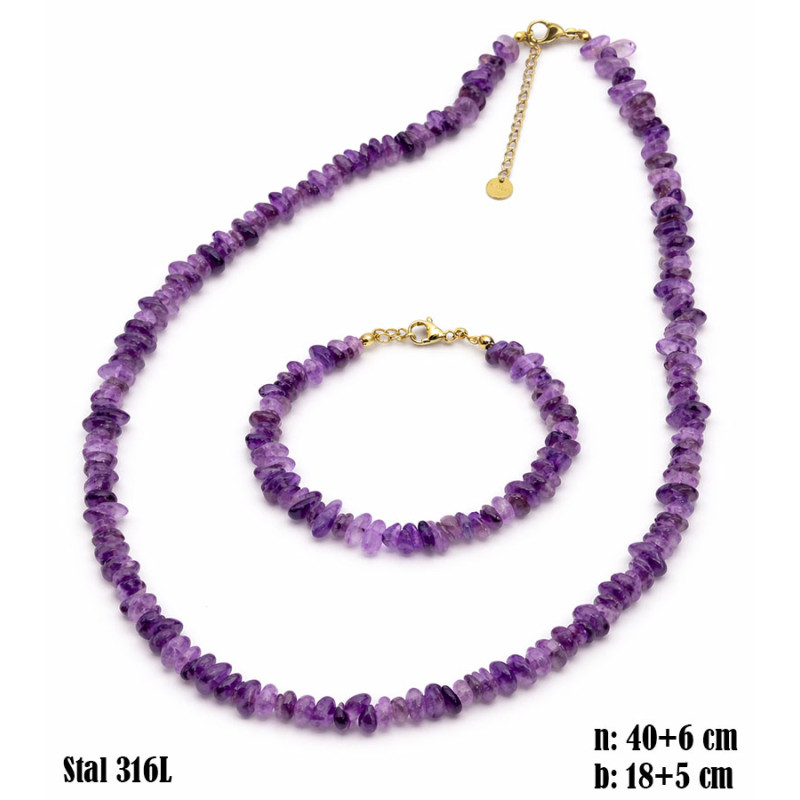 Komplet naszyjnika i bransoletki tworzy harmonijną całość utrzymaną w zróżnicowanych tonach fioletu – od jasnych, półprzezroczystych odcieni po głębsze, bardziej nasycone barwy. Nieregularne kamienie budują naturalną, lekką kompozycję, w której każdy element ma własny kształt i subtelne przejścia kolorystyczne. Całość układa się swobodnie, tworząc spójną linię zarówno na szyi, jak i na nadgarstku. Złote zapięcia stanowią eleganckie wykończenie i delikatnie kontrastują z chłodną kolorystyką kamieni.