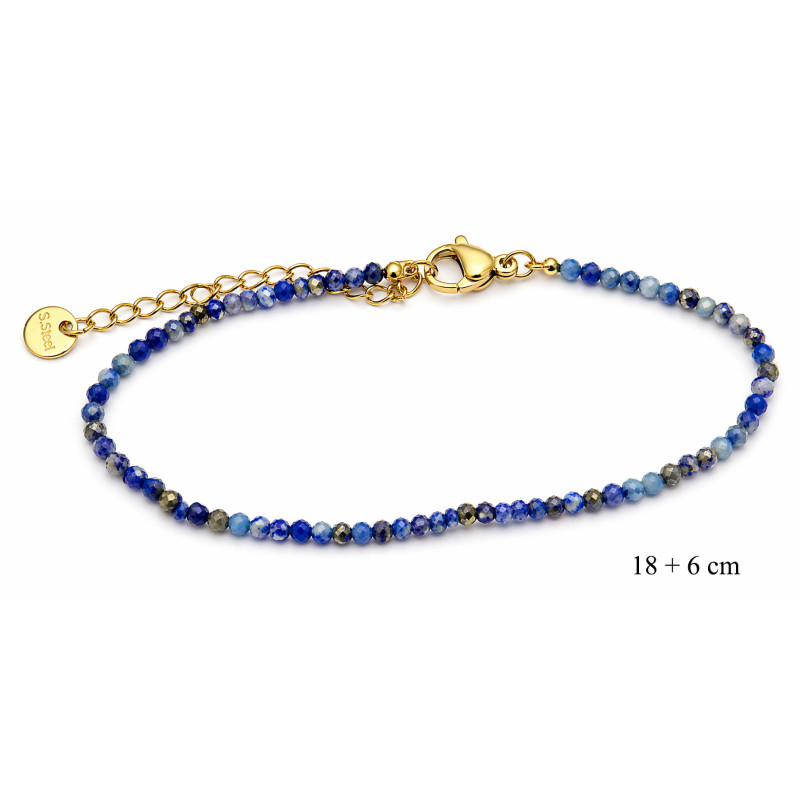Elegancka bransoletka wykonana z drobnych kamieni w odcieniach niebieskiego to subtelny, a zarazem efektowny dodatek, który pięknie podkreśli każdą stylizację. Fasetowane koraliki delikatnie odbijają światło, nadając biżuterii lekki połysk i wyjątkowy charakter.