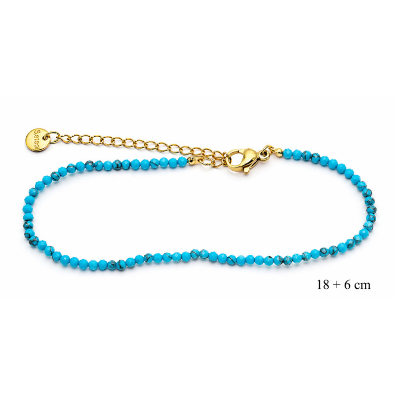 Elegancka bransoletka wykonana z drobnych kamieni w intensywnym turkusowym kolorze to modny i wyrazisty dodatek, który przyciąga uwagę swoją charakterystyczną barwą. Subtelne, fasetowane koraliki delikatnie odbijają światło, nadając biżuterii lekki połysk i elegancki wygląd.