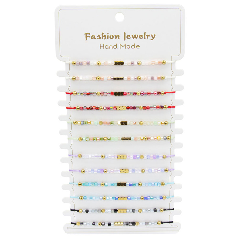 Nowoczesny zestaw delikatnych bransoletek na sznurku ozdobionych drobnymi koralikami oraz geometrycznymi elementami to idealna propozycja dla miłośniczek minimalistycznej, a zarazem modnej biżuterii. Subtelne połączenie transparentnych, pastelowych i intensywnych kolorów tworzy efektowną i uniwersalną kompozycję.