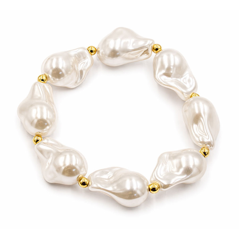 Wyjątkowa bransoletka wykonana z dużych, nieregularnych pereł to elegancki dodatek, który przyciąga uwagę swoim unikalnym kształtem i subtelnym połyskiem. Każda perła posiada indywidualną formę, co nadaje biżuterii niepowtarzalny charakter i luksusowy wygląd.