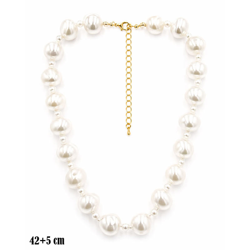Naszyjnik przyciąga uwagę wyraźnym układem dużych pereł w jasnym, kremowym odcieniu. Kuliste elementy o gładkiej powierzchni zostały rozmieszczone w regularnych odstępach, oddzielone mniejszymi koralikami, co tworzy uporządkowaną i czytelną formę. Całość układa się miękko wokół szyi, a większe perły w dolnej części podkreślają linię dekoltu. Złote zapięcie oraz przedłużka wprowadzają subtelny kontrast i dopełniają kompozycję. Długość 42 cm + 5 cm regulacji pozwala na wygodne dopasowanie.