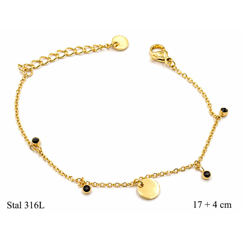 Bransoletka stal 316L złota z zawieszkami i czarnymi cyrkoniami 17 + 4 cm