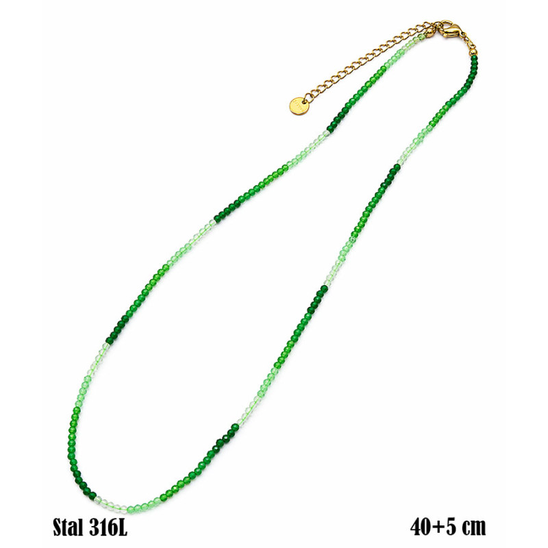 Naszyjnik wyróżnia się subtelną linią złożoną z drobnych koralików o średnicy 2 mm, które tworzą płynne przejścia tonalne. Jasne, półtransparentne elementy przechodzą w intensywniejsze odcienie zieleni, budując spokojną, naturalną kompozycję. Koraliki układają się równo, tworząc cienki, lekki łańcuch, który delikatnie podkreśla szyję. Złote zapięcie z regulacją stanowi kontrastowy akcent i ułatwia dopasowanie. Długość 40 cm + 5 cm pozwala nosić naszyjnik blisko szyi lub w nieco luźniejszym ułożeniu.