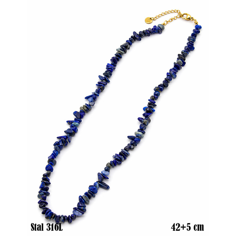 Naszyjnik przyciąga uwagę naturalnym układem nieregularnych kamieni o zróżnicowanej wielkości i formie. Elementy w odcieniach granatu, intensywnego błękitu i ciemniejszych tonów tworzą dynamiczną, lekko surową kompozycję. Każdy fragment ma inny kształt i strukturę, dzięki czemu całość wygląda swobodnie i niepowtarzalnie. Kamienie układają się miękko wokół szyi, a ich połysk podkreśla głębię koloru. Złote zapięcie z przedłużką stanowi wyraźny kontrast i ułatwia regulację. Długość 42 cm + 5 cm pozwala dopasować naszyjnik do różnych stylizacji.