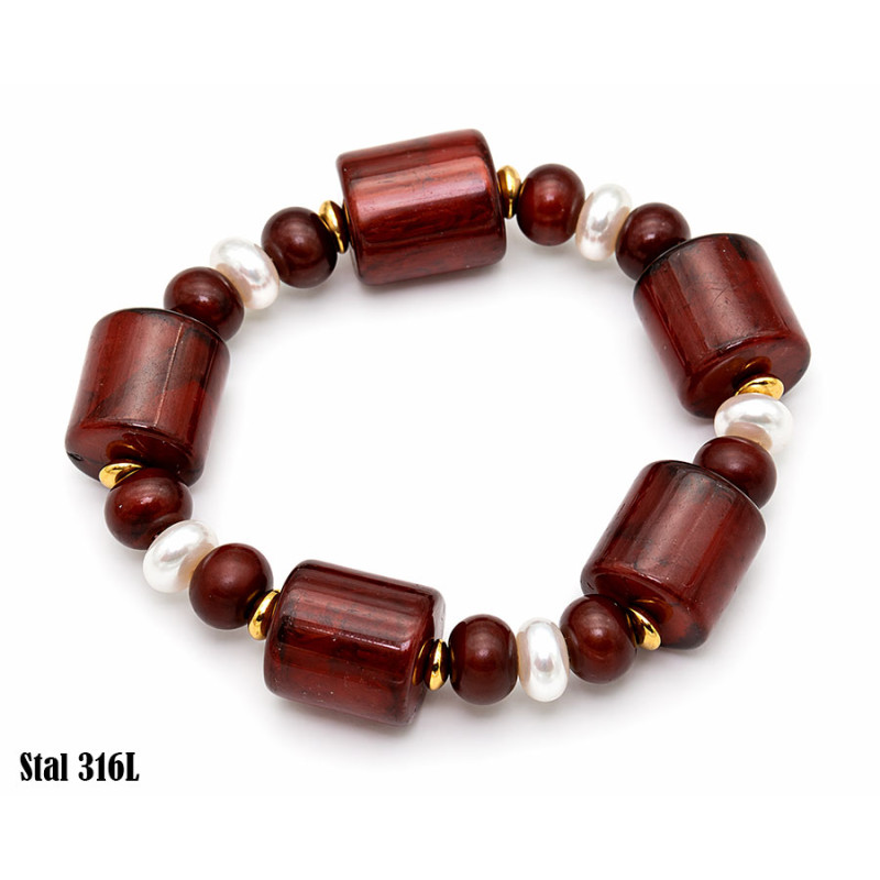 Bransoletka przyciąga uwagę mocną, rytmiczną kompozycją opartą na większych, cylindrycznych elementach w głębokim odcieniu burgundu. Pomiędzy nimi znajdują się mniejsze, okrągłe koraliki w dopasowanej kolorystyce oraz jasne, owalne elementy o gładkiej powierzchni, które wprowadzają kontrast. Całość uzupełniają złote przekładki, porządkujące układ i nadające kompozycji wyraźny rytm. Elementy tworzą zwartą, elastyczną formę, która dobrze układa się na nadgarstku i przyciąga wzrok dzięki zestawieniu faktur oraz kolorów.