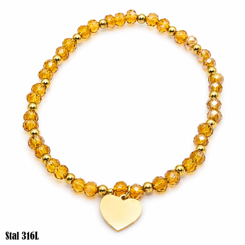 Bransoletka przyciąga uwagę ciepłą, złocistą kolorystyką oraz delikatnym połyskiem fasetowanych koralików. Elementy o wielopłaszczyznowej powierzchni odbijają światło, tworząc subtelne refleksy i nadając całości lekkości. Koraliki ułożone są w równą linię, przeplatane drobnymi, złotymi kulkami, które porządkują kompozycję i wzmacniają jej rytm. Centralnym detalem jest gładka zawieszka w kształcie serca, która wprowadza wyraźny, dekoracyjny akcent. Elastyczna forma sprawia, że bransoletka dobrze dopasowuje się do nadgarstka.