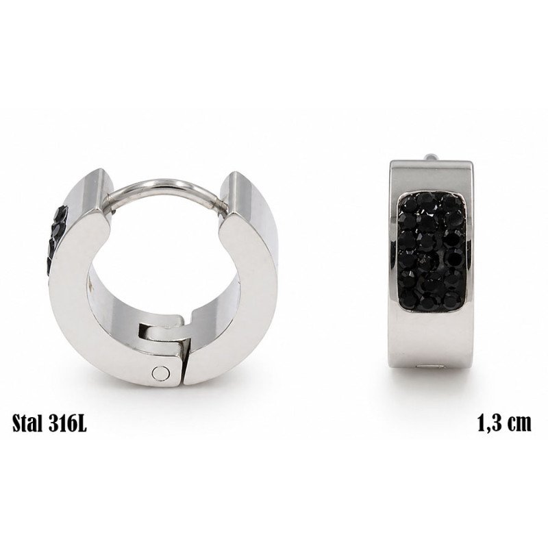 Kolczyki mają zwartą formę niewielkich kół o średnicy 1,3 cm. Ich powierzchnia jest gładka i lekko połyskująca, co podkreśla jasny, metaliczny odcień. W centralnej części frontu znajduje się prostokątna wstawka wypełniona drobnymi, czarnymi kamieniami, które tworzą wyraźny kontrast i przyciągają wzrok. Kamienie ułożono gęsto, dzięki czemu powierzchnia wydaje się jednolita i intensywna w odbiorze. Proporcjonalna konstrukcja sprawia, że kolczyki dobrze przylegają do ucha i zachowują uporządkowany charakter.