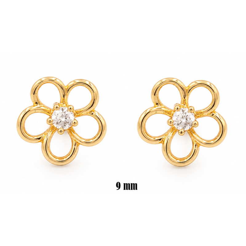 Kolczyki przedstawiają subtelny motyw kwiatka o średnicy 9 mm, wykonany w ciepłym, złotym odcieniu. Każdy płatek ma zaokrągloną, otwartą formę, co nadaje całości lekkości i elegancji. W centrum kompozycji znajduje się pojedynczy, jasny kamień o szlifie, który pięknie odbija światło i przyciąga wzrok, tworząc efekt delikatnego połysku. Gładka powierzchnia metalu podkreśla nowoczesny, a zarazem ponadczasowy charakter modelu.