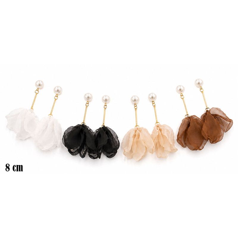 Zestaw dostępny jest w kilku uniwersalnych kolorach – od klasycznej bieli i czerni, przez subtelny beż, aż po ciepły brąz – dzięki czemu łatwo dopasować kolczyki do różnych stylizacji. Połączenie połyskujących elementów z lekką, transparentną tkaniną tworzy harmonijną i bardzo kobiecą kompozycję.