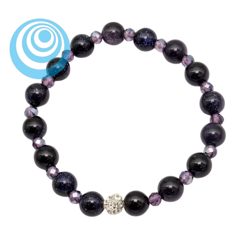 Bransoletka z kulkami o średnicy 8 mm przyciąga uwagę intensywnym, ciemnogranatowym odcieniem z drobnymi, migoczącymi refleksami. Gładkie koraliki tworzą równą kompozycję, którą uzupełniają fasetowane, fioletowe przekładki subtelnie odbijające światło. Centralnym punktem jest ozdobna kula wysadzana jasnymi kryształkami, nadająca całości elegancki, biżuteryjny charakter. Kontrast między głęboką barwą głównych elementów a jaśniejszymi detalami buduje wyrazisty, ale spójny efekt.