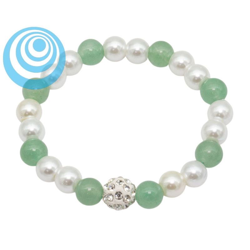 Bransoletka z kulkami o średnicy 8 mm łączy delikatną, jasną zieleń z klasycznym, perłowym połyskiem. Gładkie koraliki z awenturynu w subtelnym, pastelowym odcieniu przeplatają się z białymi perłami szklanymi, tworząc harmonijną i lekką kompozycję. Centralnym punktem jest dekoracyjna kula wysadzana drobnymi kryształkami, która dodaje całości wyrazistego blasku. Regularny układ elementów sprawia, że model prezentuje się symetrycznie i elegancko na nadgarstku.