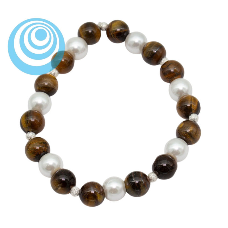 Bransoletka z kulkami o średnicy 8 mm łączy naturalny rysunek tygrysiego oka z gładkim połyskiem białych pereł szklanych. Brązowe kamienie z charakterystycznymi, złocistymi smugami tworzą ciepłą, głęboką kompozycję. Między większymi kulkami umieszczono drobne, jasne przekładki o delikatnej fakturze, które subtelnie rozjaśniają całość i nadają jej lekko biżuteryjny charakter. Regularny układ elementów zapewnia harmonijny efekt na nadgarstku.