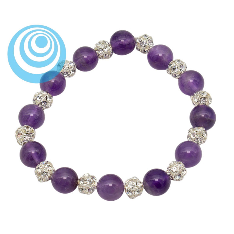 Bransoletka z kulkami o średnicy 8 mm opiera się na kontrastowym zestawieniu intensywnego fioletu i połyskujących kryształowych akcentów. Gładkie koraliki z ametystu tworzą równą, harmonijną linię, a pomiędzy nimi rozmieszczono ozdobne kule wysadzane drobnymi kryształkami. Błyszczące elementy odbijają światło i budują efekt wyraźnego, biżuteryjnego rytmu wokół nadgarstka. Całość prezentuje się elegancko i przyciąga wzrok bez nadmiernej przesady.