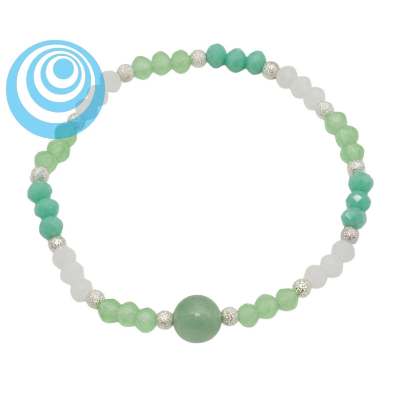 Bransoletka z kulkami o średnicy 4 i 8 mm łączy subtelne odcienie zieleni z jasnymi, półtransparentnymi elementami. Centralnym punktem jest większa, gładka kula z awenturynu, która przyciąga wzrok naturalną barwą i delikatnym rysunkiem kamienia. Po bokach rozmieszczono mniejsze, fasetowane koraliki w zielonym odcieniu oraz jasne, matowe elementy, które nadają kompozycji lekkości. Całość uzupełniają drobne, srebrzyste przekładki o fakturowanej powierzchni, wprowadzające subtelny połysk.