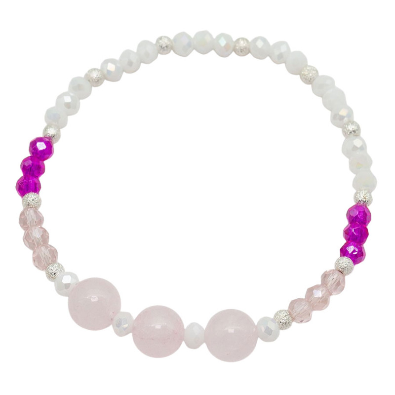 Ta bransoletka przyciąga wzrok delikatnym połączeniem jasnych, mlecznych koralików z akcentami intensywnego różu. Większe, gładkie kule w pudrowym odcieniu stanowią centralny punkt kompozycji, a drobniejsze, fasetowane elementy odbijają światło i dodają całości lekkości. Kontrastujące wstawki w wyrazistym, malinowym kolorze przełamują pastelową bazę i wprowadzają energię. Srebrzyste przekładki subtelnie rozdzielają segmenty, porządkując formę i podkreślając rytm całego projektu.