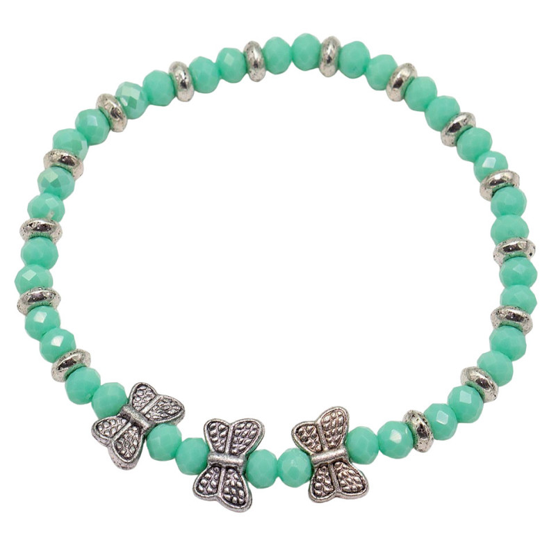 Bransoletka przyciąga świeżą, miętową barwą drobnych, fasetowanych koralików. Ich szlifowana powierzchnia delikatnie odbija światło i nadaje całości subtelny blask. Rytm kompozycji podkreślają srebrzyste przekładki, które wprowadzają wyraźne akcenty pomiędzy koralikami. Centralnym punktem są trzy ozdobne motyle w srebrnym kolorze. Ich ażurowa faktura i dekoracyjne detale nadają bransoletce romantycznego, lekkiego charakteru.