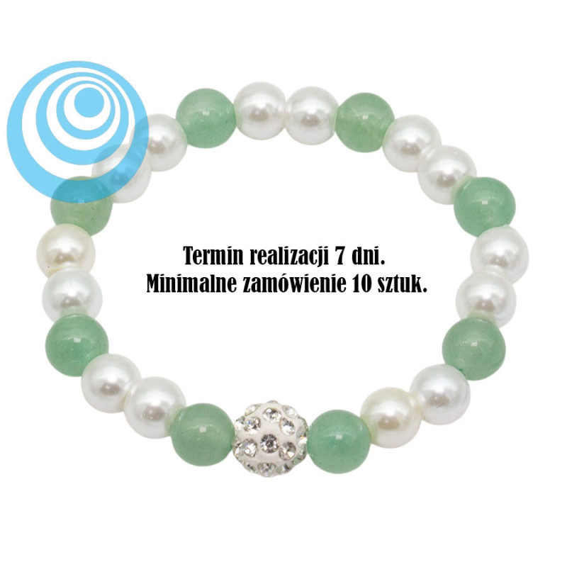 Bransoletka z kulkami o średnicy 8 mm łączy delikatną, jasną zieleń z klasycznym, perłowym połyskiem. Gładkie koraliki z awenturynu w subtelnym, pastelowym odcieniu przeplatają się z białymi perłami szklanymi, tworząc harmonijną i lekką kompozycję. Centralnym punktem jest dekoracyjna kula wysadzana drobnymi kryształkami, która dodaje całości wyrazistego blasku. Regularny układ elementów sprawia, że model prezentuje się symetrycznie i elegancko na nadgarstku.